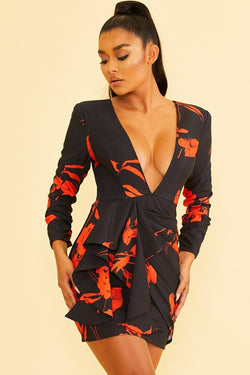 Elegant Black Red Floral Print Deep V-Neck Ruffle Tie-Up Open Back Dress with Long Sleeve
