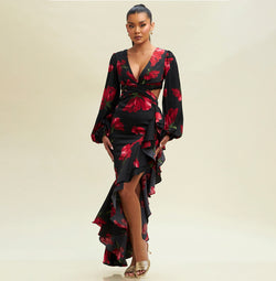 This exquisite maxi dress embodies sophistication and luxury. The black satin fabric is adorned with a beautiful multi-color floral print, creating a stunning visual contrast. The cut out ruffle detail adds an elegant touch, while the V-neck and side slit highlight your silhouette. The bell sleeves add a touch of graceful movement. Elevate your wardrobe with this exclusive piece.