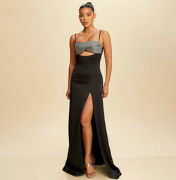Indulge in the ultimate luxury with our Elegant Black Strap Silver Studded Crystal Detailed Cut Out Satin Open Back Maxi Dress. This stunning piece features intricate studding and crystal detailing, with a sensual cut out design and a middle slit for a touch of elegance. Elevate your style and make a statement at any event.