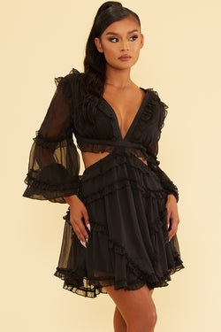 Elegant Black V-Neck Ruffle Cut-Out Back Tie-Up Dress with Long Sleeve