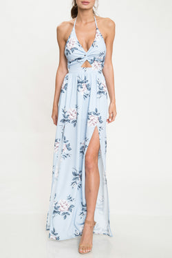 Elegant Blue Floral Print Cut Out Tie-Up Maxi Dress with Slit