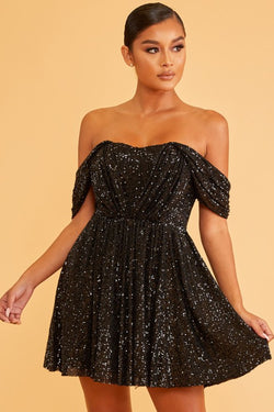 Elegant Cocktail Off Shoulder V-Neck Black Sequence Dress