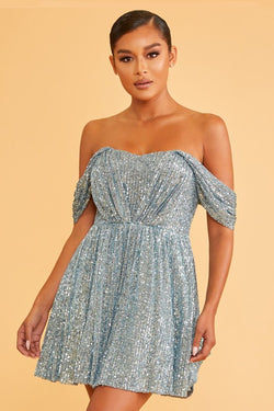 Elegant Cocktail Off Shoulder V-Neck Slate Blue Sequence Dress