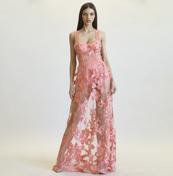 Elegant Coral Couture Strap Corset Floral Embroidery Gown