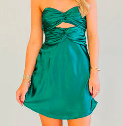 Elegant Forest Green Strapless Satin Double Twist Detailed Back Tie-Up Mini Dress