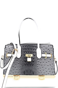 Elegant Grey Ostrich Print Padlock Satchel with Bottom Compartment