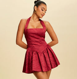 Indulge in luxury with our Elegant Halter Wine Crinkle Satin Ruffle Dress. The rich wine color and delicate ruffles add a touch of sophistication to this halter-style dress, perfect for any special occasion. The crinkle satin fabric drapes beautifully for a truly elegant look. Elevate your wardrobe with this exclusive piece.