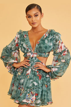 Elegant Hunter Green Multi-Color Floral Print V-Neck Ruffle Cut-Out Back Tie-Up Dress with Long Sleeve