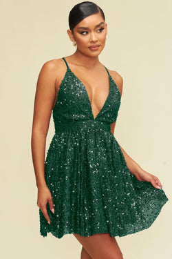 Elegant Hunter Green Sequence Strap V-Neck Ruffle Dress