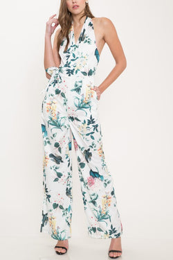 Elegant Leaf Print Halter Tie-Up Jumpsuit