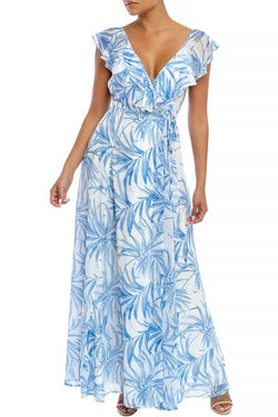 Elegant Light Blue Leaf Print Wrap Ruffle Strap Maxi Dress