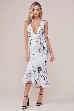 Elegant Multi-Color Floral Print V-Neck Ruffle Tie-Up White Dress