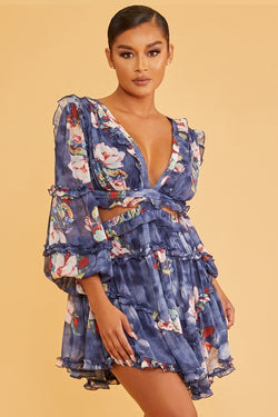 Elegant Navy Multi-Color Floral Print V-Neck Ruffle Cut-Out Back Tie-Up Dress with Long Sleeve