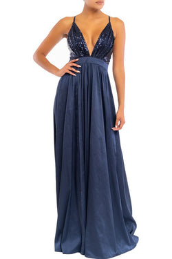 Elegant Navy Sequence Strap Deep V-Neck Satin Maxi Dress