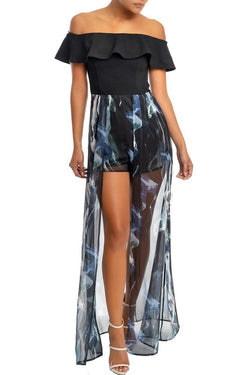 Elegant Off Shoulder Black Navy Floral Print Maxi Romper