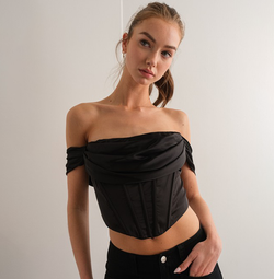 Elegant Off Shoulder Black Satin Boning Detailed Corset Crop Top