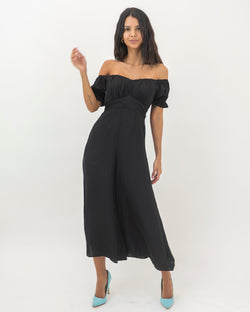 Elegant Off Shoulder Black Satin Tie-Up Ruffle Jumpsuit