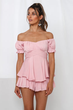Elegant Off Shoulder Blush Tie-Up Ruffle Romper