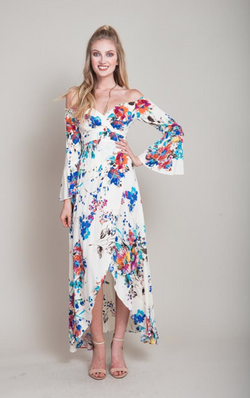 Elegant Off Shoulder Floral Multi-Color Maxi Dress with Bell Sleeve