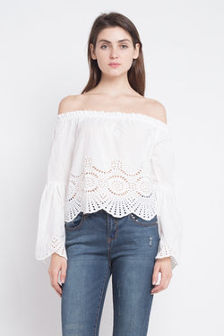 Elegant Off Shoulder White Lace Top with Long Sleeve