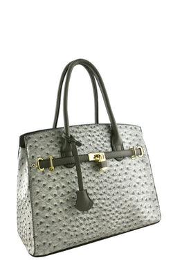 Elegant Ostrich Print Grey Padlock Top Handle Tote Bag