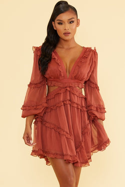 Elegant Rose V-Neck Ruffle Cut-Out Back Tie-Up Dress with Long Sleeve