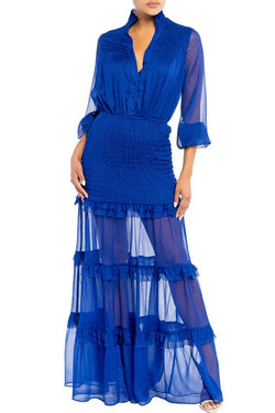 Elegant Royal Blue Button Down Elastic Ruffle Maxi Dress with Long Sleeve