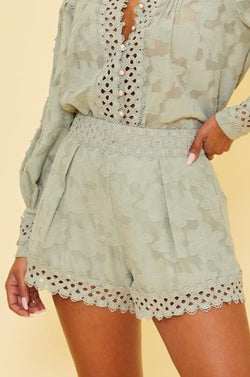 Elegant Sage Lace High Waisted Floral Detailed Textured Shorts