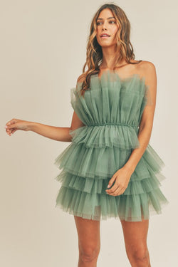 Elegant Sage Strapless Ruffle Tulle Mini Dress