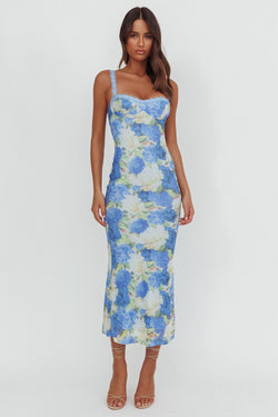 Discover timeless elegance with this sophisticated maxi dress, featuring a graceful blue floral print that captures effortless refinement. Delicate lace detailing adorns the design, adding an extra layer of visual interest and texture. The structured straps provide comfortable support while maintaining a polished silhouette perfect for evening events, special occasions, or elevated everyday wear. The flowing maxi length creates a flattering, elongated look that exudes confidence and style. An ideal choice for those seeking a dress that balances femininity with understated luxury.