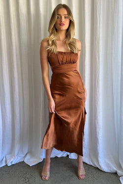 Elegant Strap Chocolate Satin Maxi Dress Open Back Tie-Up with Slit