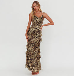 Elegant Strap Leopard Print Ruffle Maxi Dress