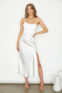 Elegant Strap White Satin Maxi Dress Open Back Tie-Up with Slit