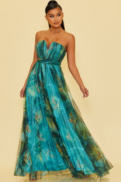 Elegant Strapless Blue Green Tropical Print Pleated Maxi Dress