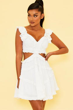 Elegant Summer White V-Neck Ruffle Cut-Out Back Tie-Up Dress with Band Sleeve Detailed
