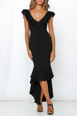 Elegant V-Neck Black High Low Ruffle Open Back Sleeveless Dress