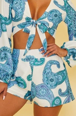 Elegant White Blue Baroque Print High Waisted Shorts