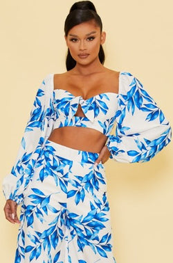Elegant White Blue Floral Print Front Tie-Up Crop Top with Bell Sleeve