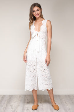 Elegant White Lace Jumpsuit with Tie-Up Detailed