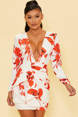 Elegant White Red Floral Print Deep V-Neck Ruffle Tie-Up Open Back Dress with Long Sleeve