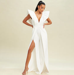 Elegant White V-Neck High Low Puffy Cut Out Jumpsuit