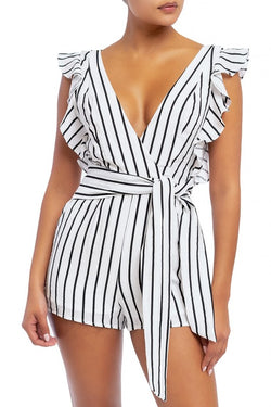 Fashion Black Contrast Ruffle Tie-Up Romper with Band Sleeve Detailed