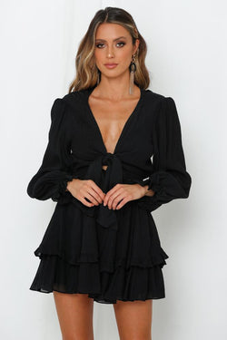 Fashion Black Deep V-Neck Tie-Up Ruffle Dress with Long Sleeve