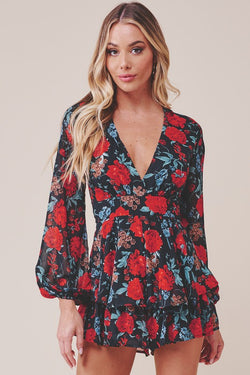 Fashion Black Multi-Color Floral Print Ruffle Tie-Up Romper with Bell Sleeve