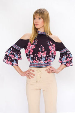Fashion Cold Shoulder Black Floral Print Top with Bell Sleeve