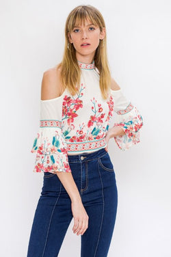Fashion Cold Shoulder Off White Floral Print Top with Bell Sleeve