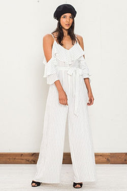 Fashion Cold Shoulder White Contrast Ruffle Jumpsuit