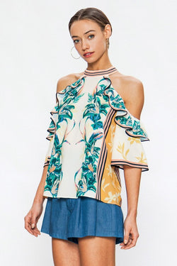 Fashion Ivory Halter Ruffle Cold Shoulder Multi-Color Floral Print Top