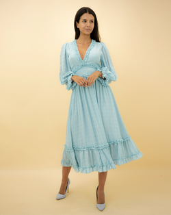 Fashion Light Blue Detailed Print V-Neck Ruffle Maxi Dress