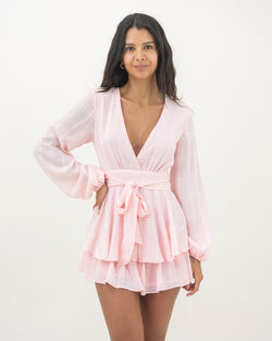 Fashion Light Pink Checkered Ruffle Tie-Up Romper with Bell Sleeve